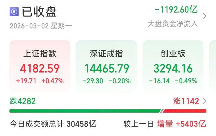 美国和以色列2月28日对伊朗发起军事打击后,全球市场避险情绪升温,情绪传递至A股市场,截至3月2日收盘,A股三大指数涨跌不一,沪指报4182.59点,涨0.47%,深证成指报14465.79点,跌0.20%,创业板指报3294.16点,跌0.49%,全市场逾4200股下跌,油气、黄金股则逆市上涨,掀起涨停潮,“三桶油”更是历史首次收盘集体涨停。